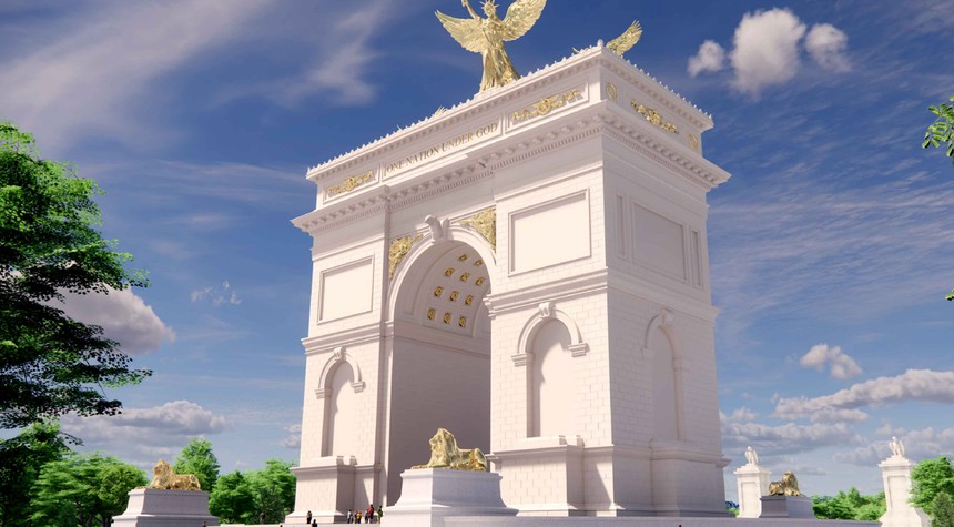 The proposed site sits in a traffic circle on the Virginia side of the Potomac, wedged between the Lincoln Memorial and Arlington National Cemetery. It’s technically DC land, which means federal jurisdiction, which means this becomes everyone’s problem. Harrison Design, a Washington architecture firm, drew up the plans. They show inscriptions reading “One Nation Under God” and “Liberty and Justice For All” on either side, gold-colored Lady Liberty statues flanked by eagles at the top, and four lion statues around the base. It’s meant to look like Paris’s Arc de Triomphe, except bigger. Always bigger.